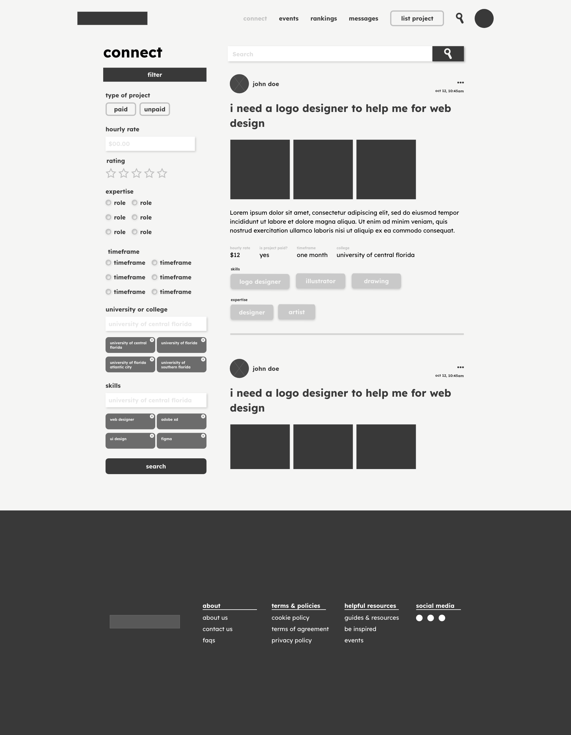 Inside the connect page the user can see the filter section on the left and feed on the right of different projects students can assist with. The user will also be able to send messages and see events, and rankings of current students. The user can also press "list project" for assistance. The user can also search by clicking the search icon next to the profile image. The profile image includes a dropdown that includes: