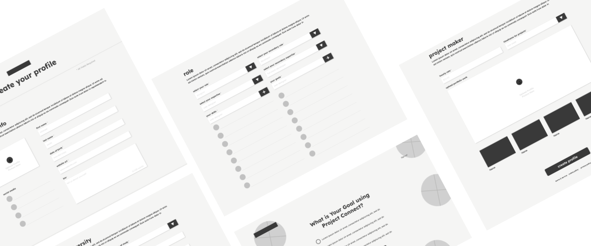 Once I have everything I need, I now create the layout I want to use for Project Connect. For the wireframes, I begin with a monochromatic outline that highlights how it will work. As the user enters http:*/www.projectconnect.com, they will be directed to the landing page, which elaborates on what we do, how it works, and inspiration on what students can do here. The max width for the website is 1200px, and each div section is spaced out 243px for the landing page. As the user scrolls down, they will learn more about the roles and expertise we focus on. Specifically for lists, row gaps will be 12px apart, and column gaps will be around 55-60px. For grids, column gaps will be 211 px, and row gaps will be 75 px.